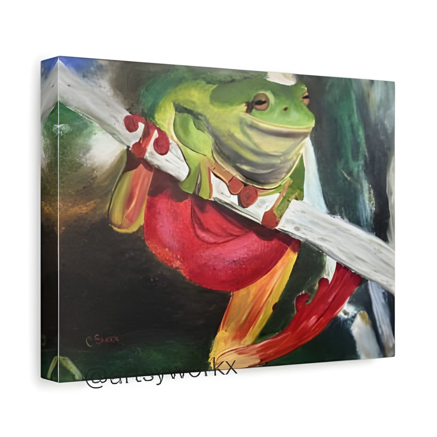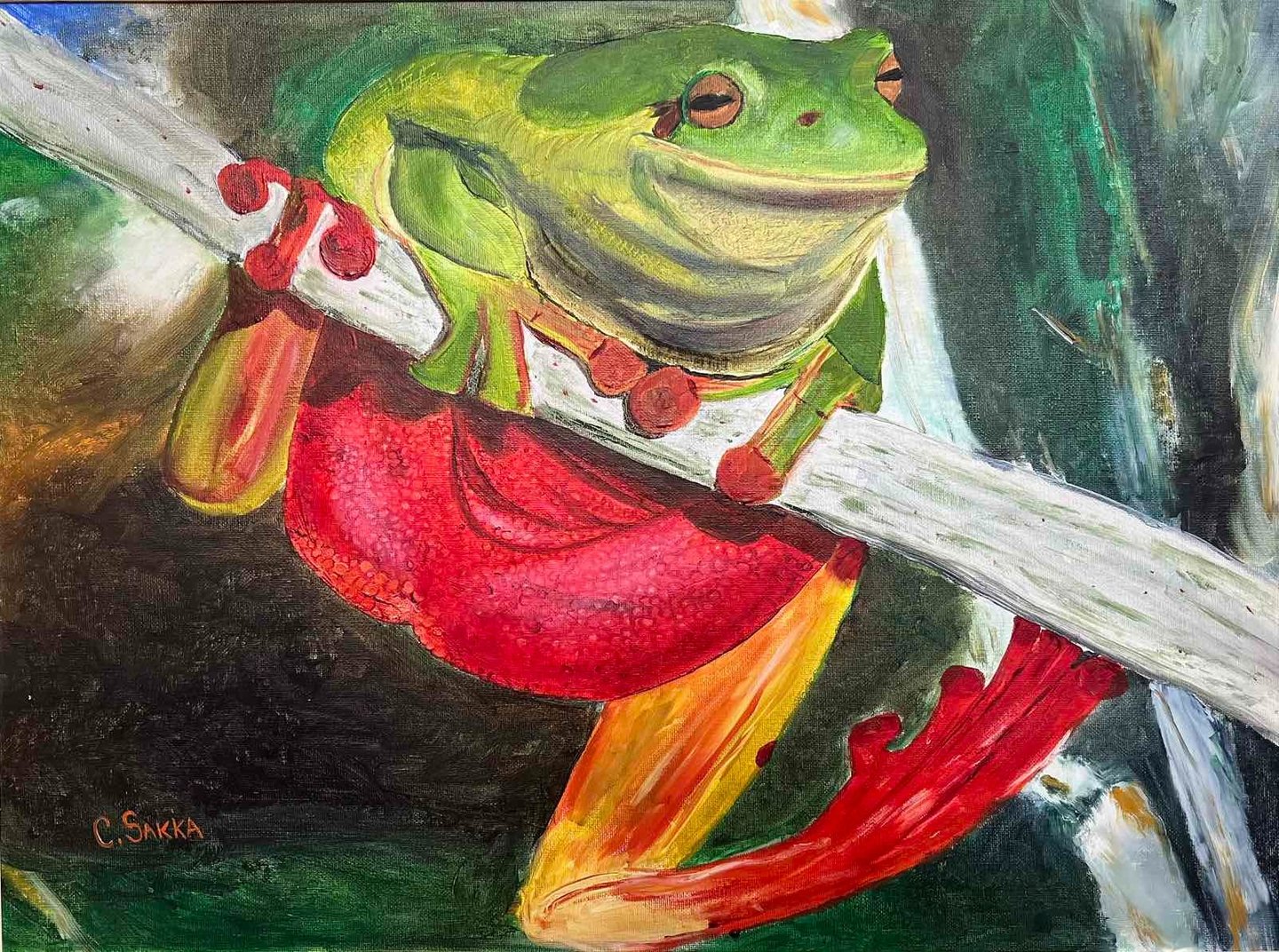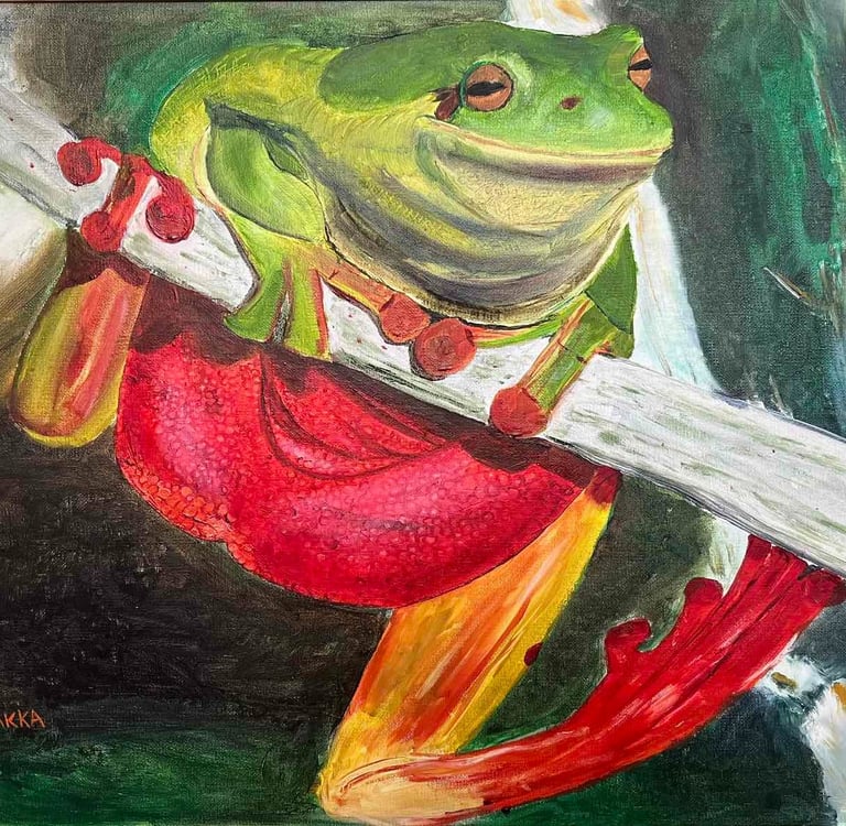 A vibrant depiction of a green tree frog, showcasing its colorful features and natural habitat.