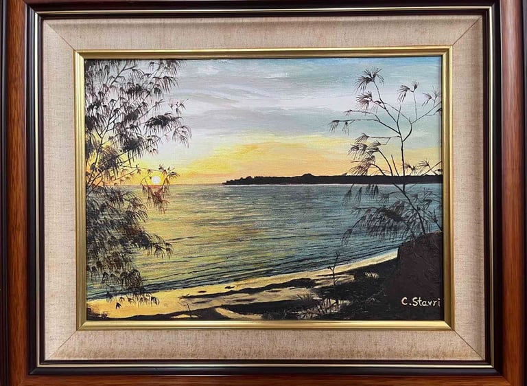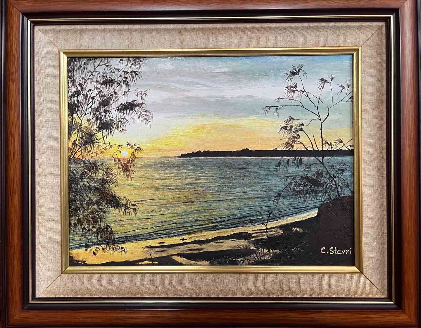 An oil painting celebrating the golden tones and serene atmosphere of an East Point sunset