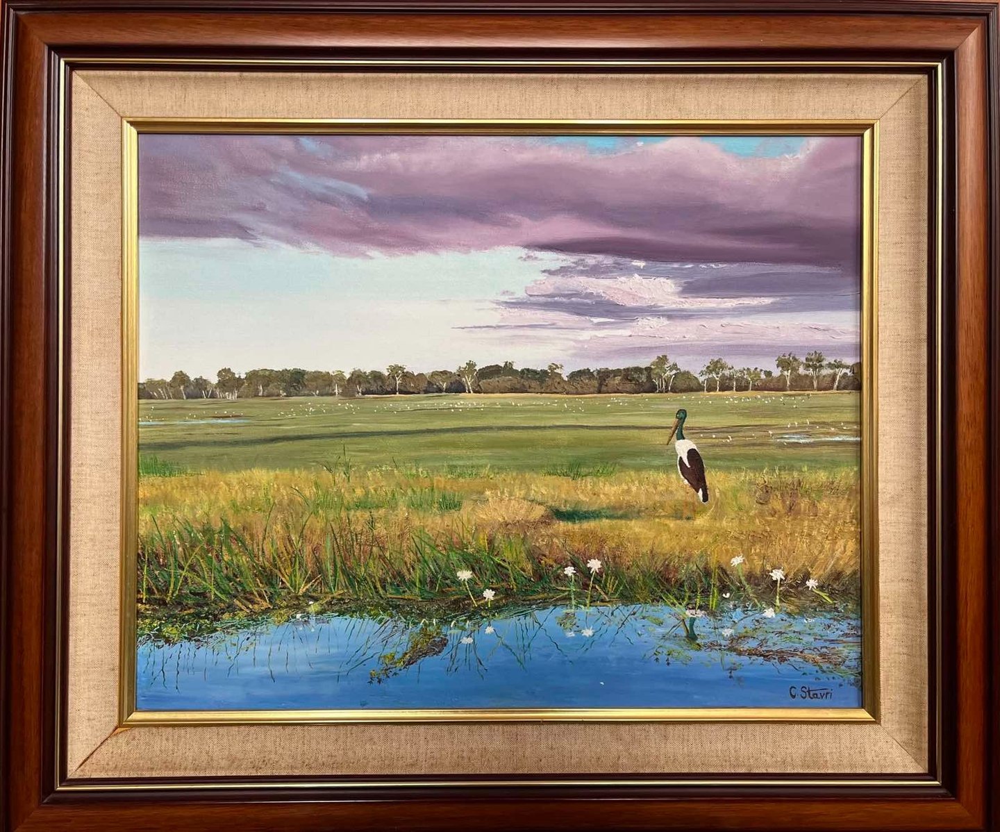 A stunning jabiru gracefully poised amidst the serene beauty of Australian wetlands, surrounded by delicate flora。